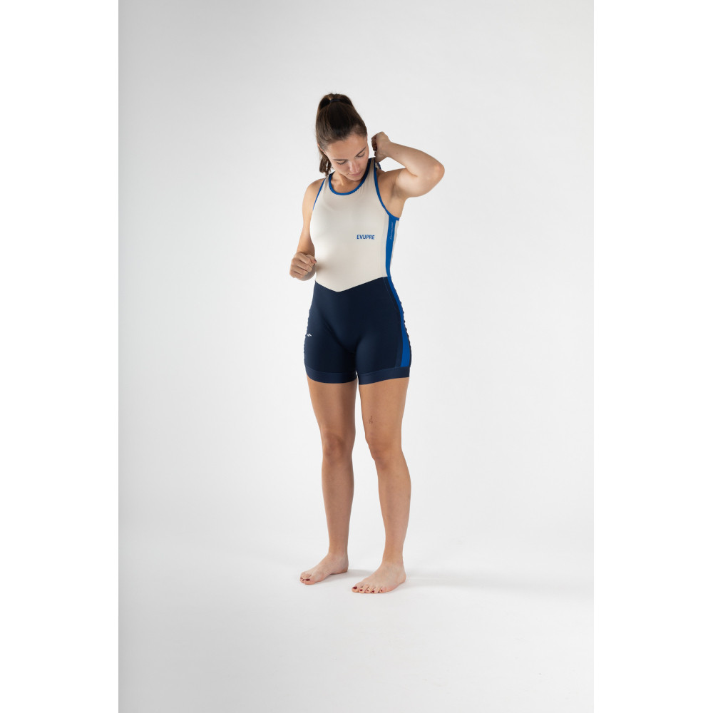 The Mechelen design convinces with its elegant colour scheme: a natural white top with indigo blue details meets the characteristic mesh side panels. These are adorned with narrow stripes in indigo blue with the French starter commands "Êtes-vous prêts?" on one side and "Partez!" on the other – a tribute to the international rowing scene. The straps are edged in indigo blue edges and underline the sophisticated look. The pants are in midnight blue.